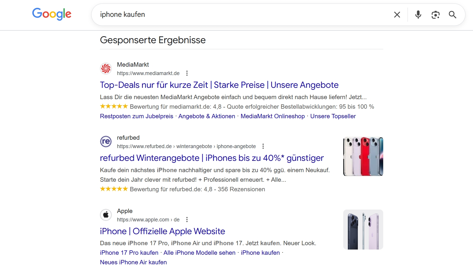Product ads are often found above the organic search results as advertisements, but sometimes they are also displayed on the side. These are also clearly recognizable as advertisements.