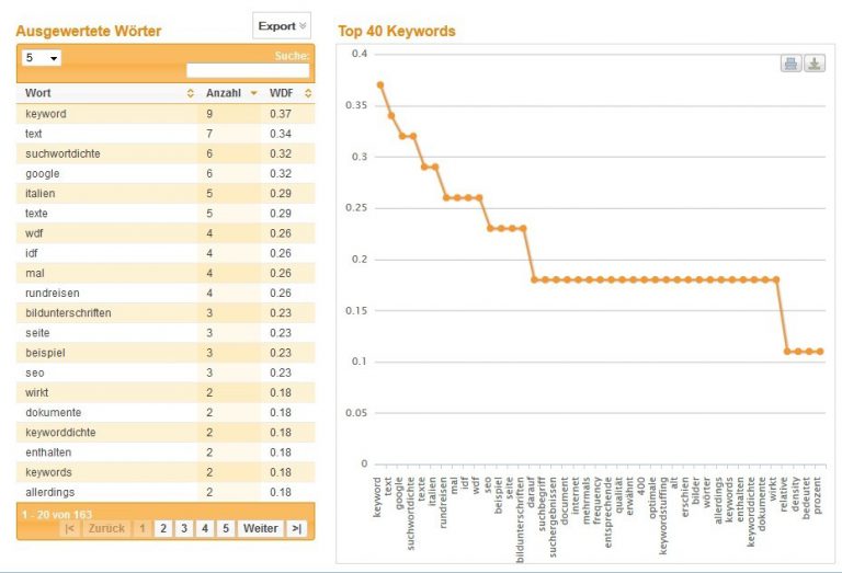 It is important to choose keywords for investigation that are relevant. For terms with too high search volume, improving the WDF/IDF might not bring much, because then signals from a website like domain popularity are more important for the search engine.