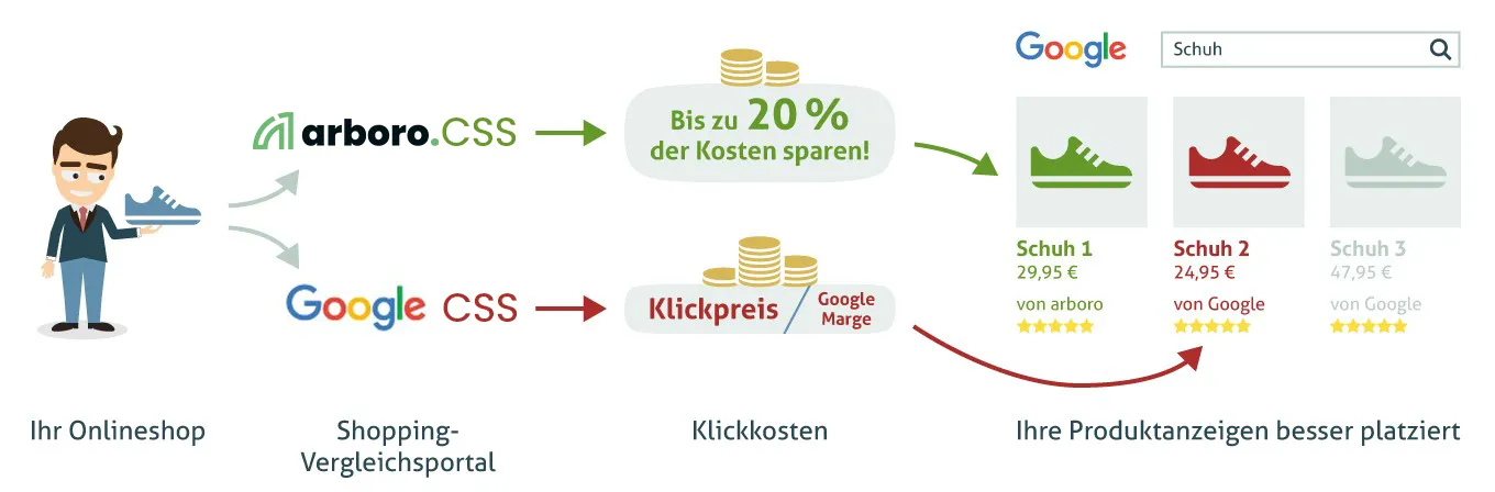 With your connection to the arboro Comparison Shopping Services (CSS), you save 20% on the click price for Google Shopping thanks to a simple technical step. This is made possible by the elimination of the usual margin. Nothing changes in your ads themselves with the CSS.