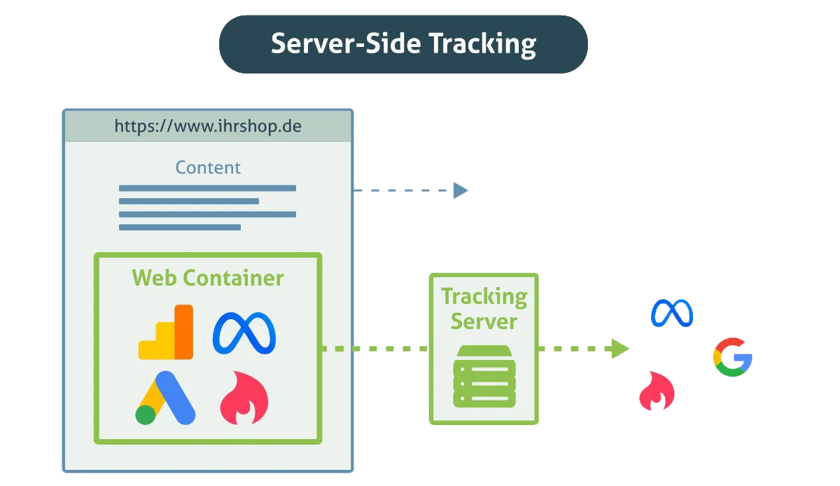 With server-side tracking, on the other hand, the data is first sent to your own tracking server before being forwarded to the analysis platforms of Google, Facebook, or Hubspot. The server is operated by you, and the third party has no access to it. The server acts as protection for your customers against the data hunger of search giants. You receive all the necessary tracking information, access more data records, and do not have to accept any disadvantages compared to client-side tracking.